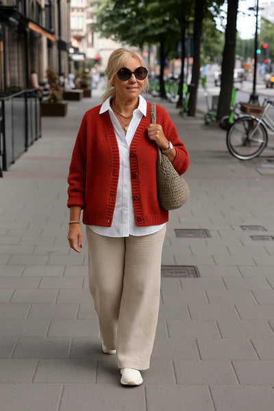 Die Strickjacke Seliora mit Strukturmuster verbindet Alltagskomfort mit zurückhaltender Eleganz. Mit ihrem weichen Strickmuster, der lockeren Silhouette und den charmanten Taschendetails hält diese Strickjacke Sie warm und sorgt gleichzeitig für einen mühelos gepflegten Look. Ein vielseitiges Kleidungsstück, das jeder Garderobe Wärme und Charakter verleiht.